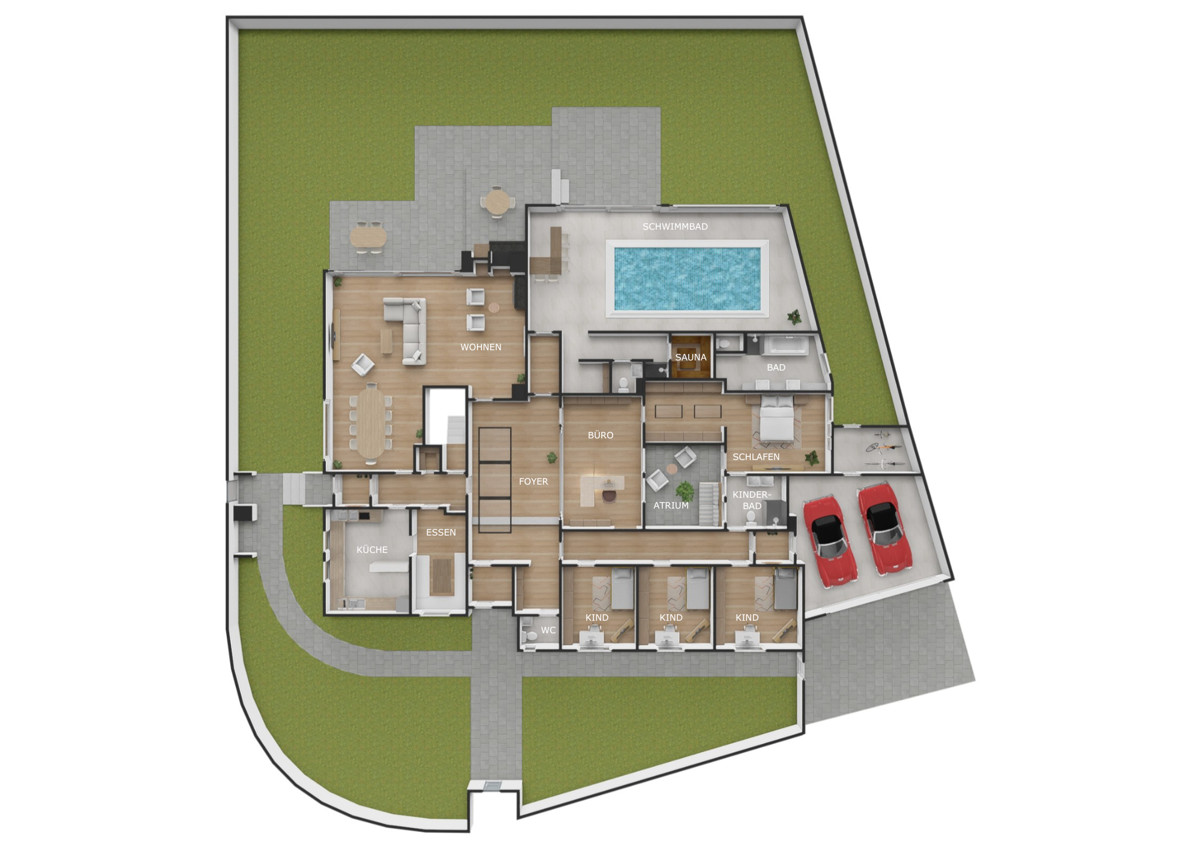 Im privaten Bereich befinden sich drei nahezu gleich große Kinderzimmer mit eigenem Kinderbad sowie der Elterntrakt mit Schlafzimmer, Ankleide und Bad en Suite – perfekt für ein harmonisches Familienleben.