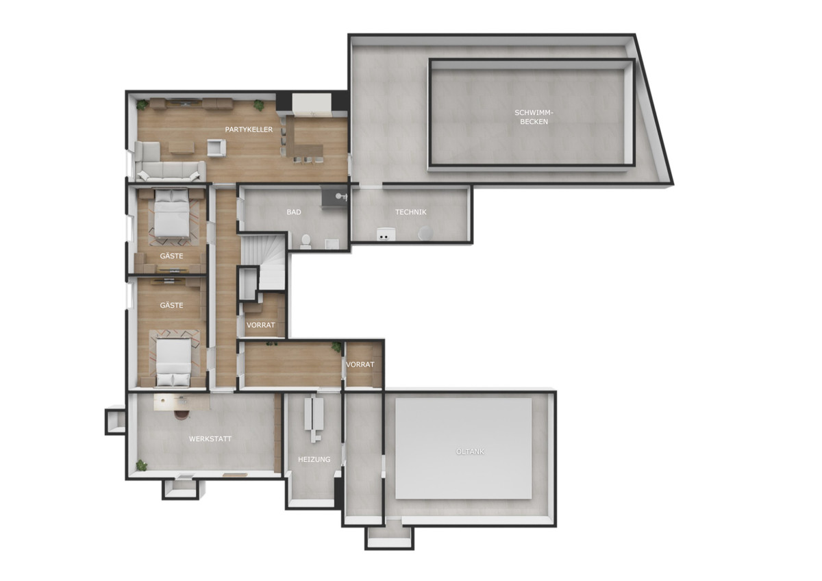 Im Untergeschoss stehen zwei separate Gästezimmer mit eigenem Bad zur Verfügung. Außerdem gibt es einen vielseitig nutzbaren Partyraum sowie reichlich Stauraum in mehreren Keller- und Abstellräumen.