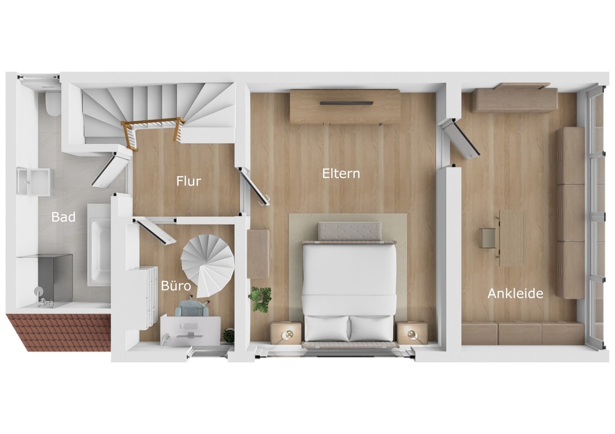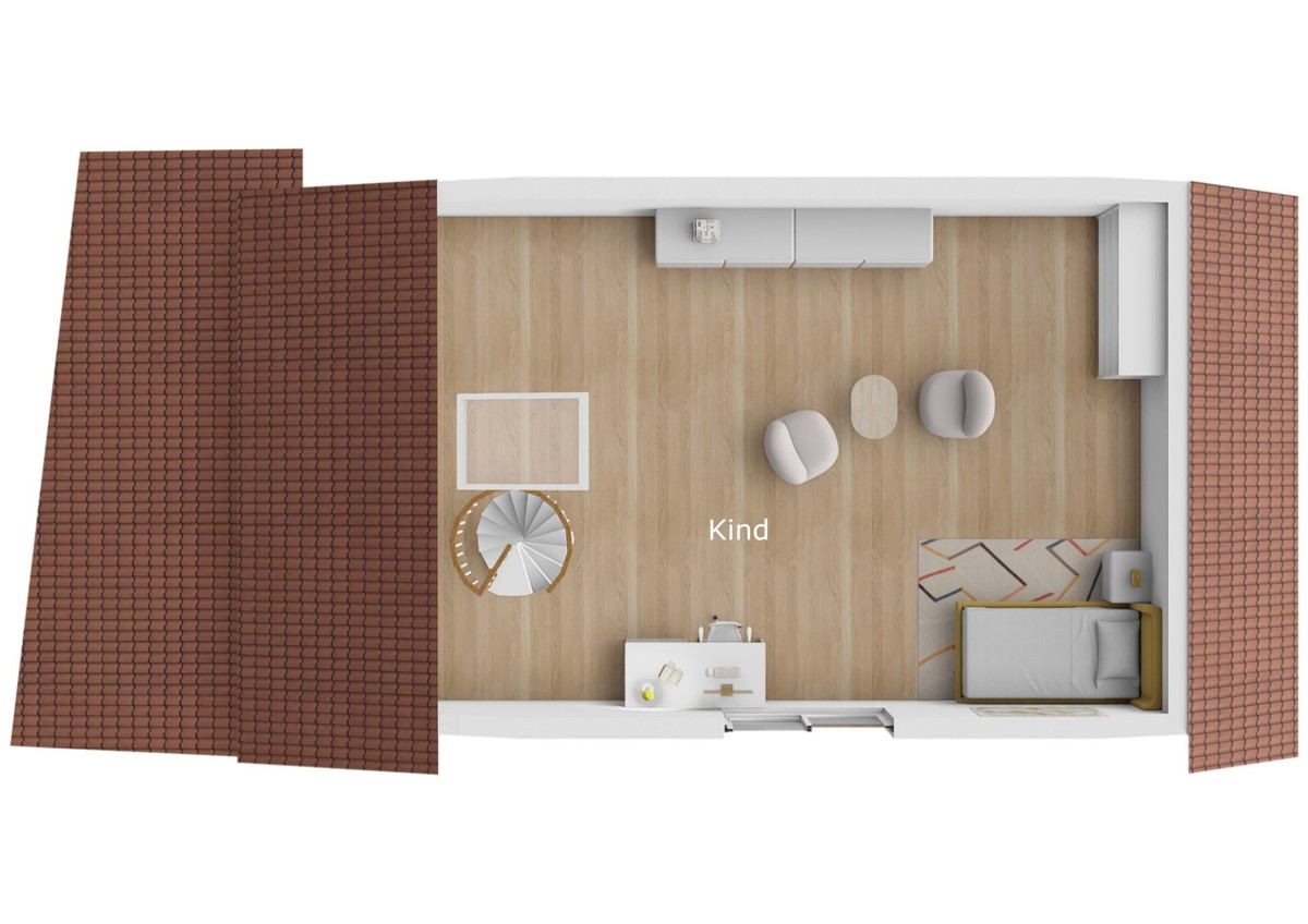 Im Dachgeschoss bietet das Studio zusätzlichen Raum – als Kinderzimmer, Arbeitsbereich oder einfach zum Entspannen.