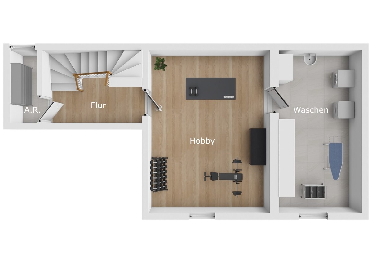 Der Keller erweitert die Nutzfläche um eine Waschküche, Vorratskammer und einen Hobbyraum.