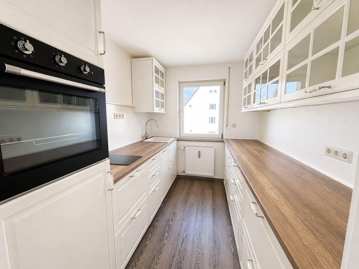 Das Wohnzimmer bietet ausreichend Platz für eine gemütliche Sofaecke sowie einen Essplatz. Die separate Küche ist bereits mit einer Einbauküche ausgestattet.