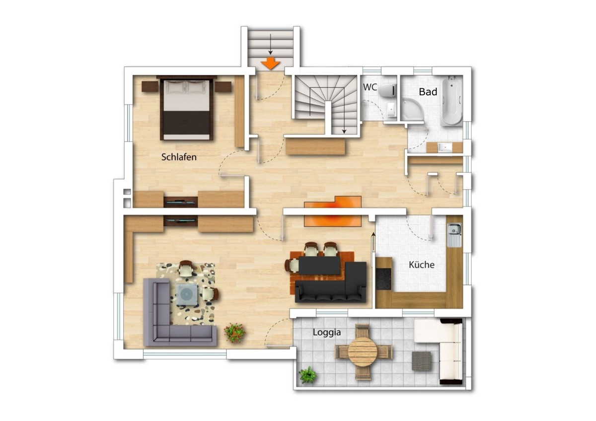 Im Erdgeschoss liegt das großzügiges Wohn- und Esszimmer mit direktem Zugang zur überdachten Süd-Loggia. Ein Kachelofen sorgt dabei für eine angenehme Wohnatmosphäre. Die separate Küche bietet ausreichend Platz für den Familienalltag. Auf dieser Etage befindet sich außerdem das Elternschlafzimmer. Ein Tageslichtbad mit Wanne und Dusche sowie ein Gäste-WC runden das Raumangebot ab.
