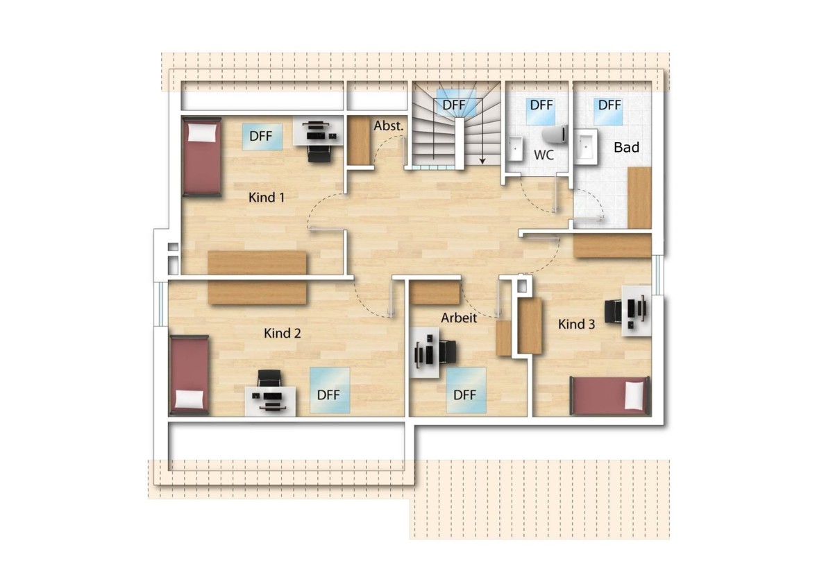 Im ausgebauten Dachgeschoss sind darüber hinaus drei weitere Zimmer, ein Arbeitszimmer, ein separates WC, ein Waschzimmer (mit Waschbecken) und eine Abstellkammer untergebracht.