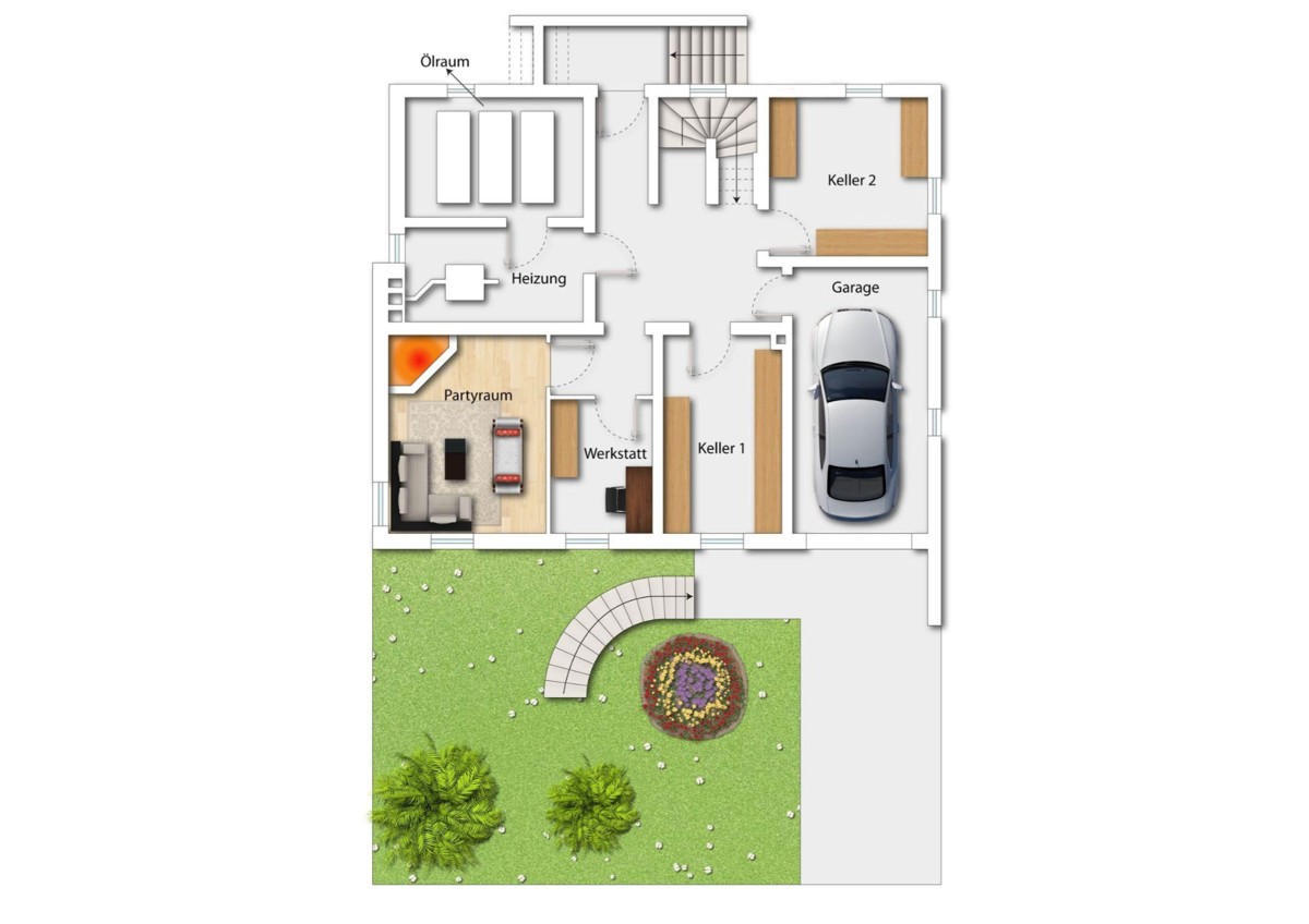 Im Untergeschoss befindet sich ein ausgebauter Partyraum mit offenem Kamin – ideal für gesellige Abende. Ergänzt wird das Raumangebot durch eine Werkstatt, zwei Kellerräume, den Heizraum sowie den direkten Zugang zur integrierten Einzelgarage.