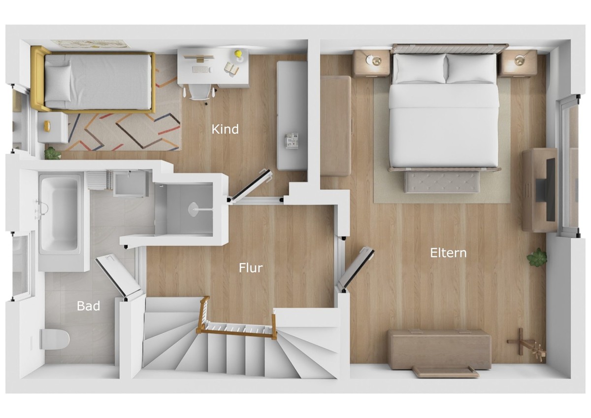 Im ersten Obergeschoss befindet sich das große Schlafzimmer sowie ein Kinderzimmer. Das helle und moderne Tageslichtbad, ausgestattet mit Badewanne und Dusche, bietet viel Komfort und ausreichend Platz für die ganze Familie.