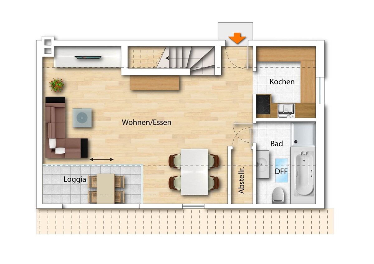 In der unteren Ebene erwarten Sie ein modernes Badezimmer mit Dusche und Wanne, die Küche, ein großzügiger Ess- und Wohnbereich sowie die sonnige Dachloggia mit elektrischer Markise. Über eine Treppe gelangen Sie in die obere Ebene mit Schlafzimmer samt Einbauschrank, einem separaten WC mit Waschmaschinenanschluss, zwei separaten Home-Offices sowie praktischen Abstellnischen.