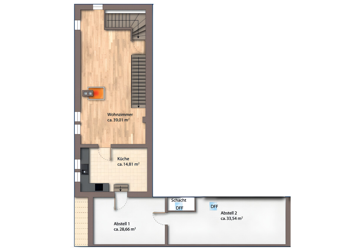 Ergänzt wird das Angebot durch drei große Dachräume, die der Wohnung zur alleinigen Nutzung zugeordnet sind. Sie schaffen wertvolle zusätzliche Nutzfläche, ideal als Stauraum, Atelier oder Hobbybereich.