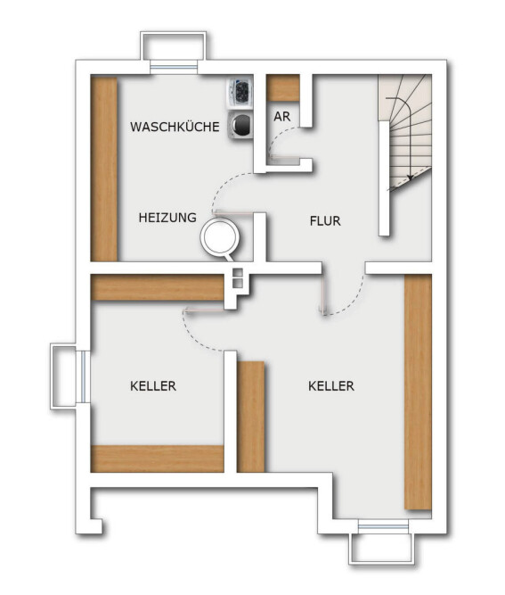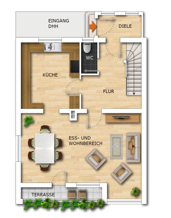 Im Erdgeschoss erwartet Sie ein großzügiges Wohn- und Esszimmer. Die Küche ist separat gehalten und verfügt über eine praktische Durchreiche, wer es moderner mag, kann den Bereich auch öffnen. Ein Gäste-WC rundet das Erdgeschoss komfortabel ab.