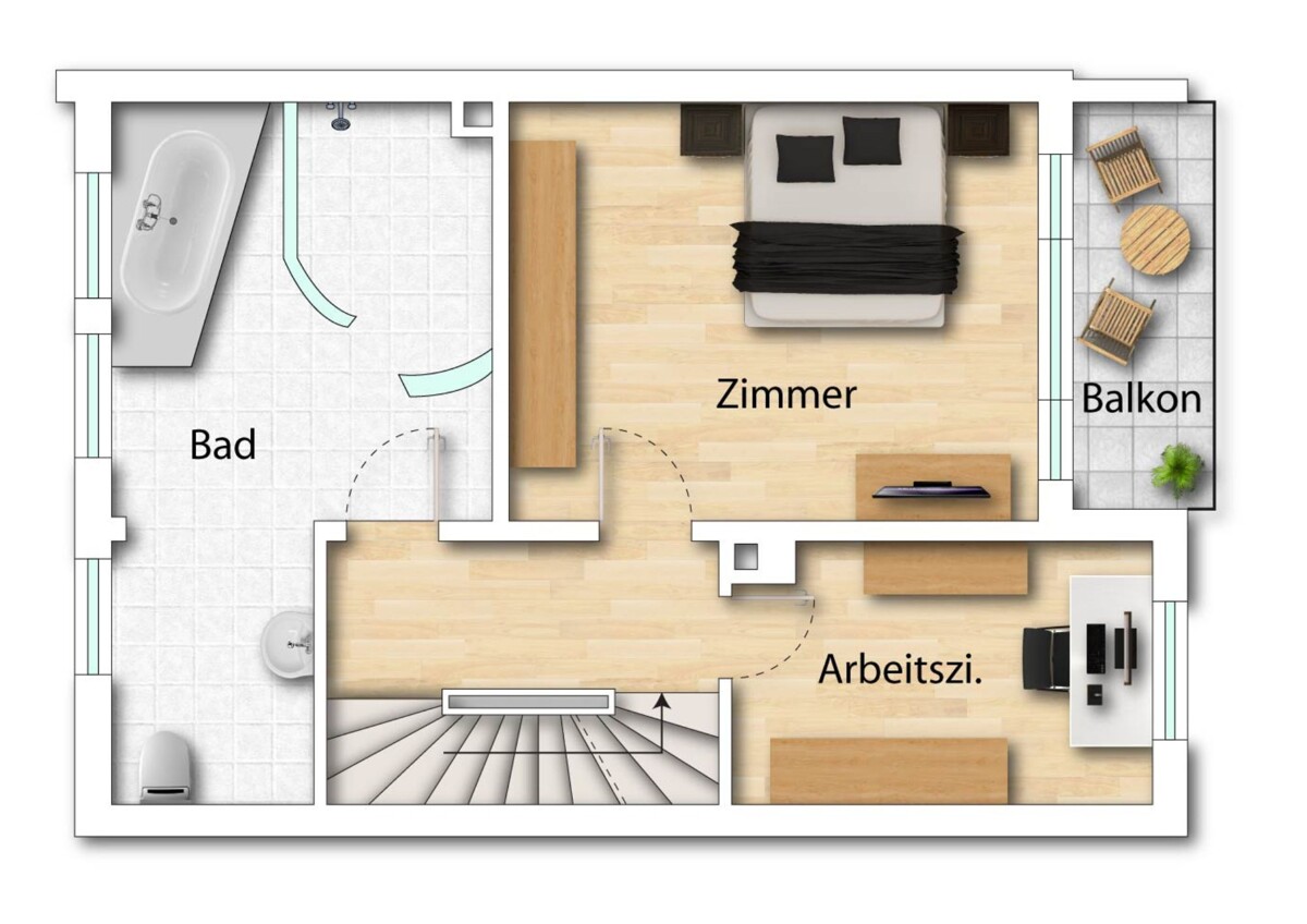 Im Obergeschoss erwarten Sie ein geräumiges Schlafzimmer mit Balkon, ein Kinder- oder Arbeitszimmer sowie ein komfortables Tageslichtbad mit Wanne und Erlebnisdusche.