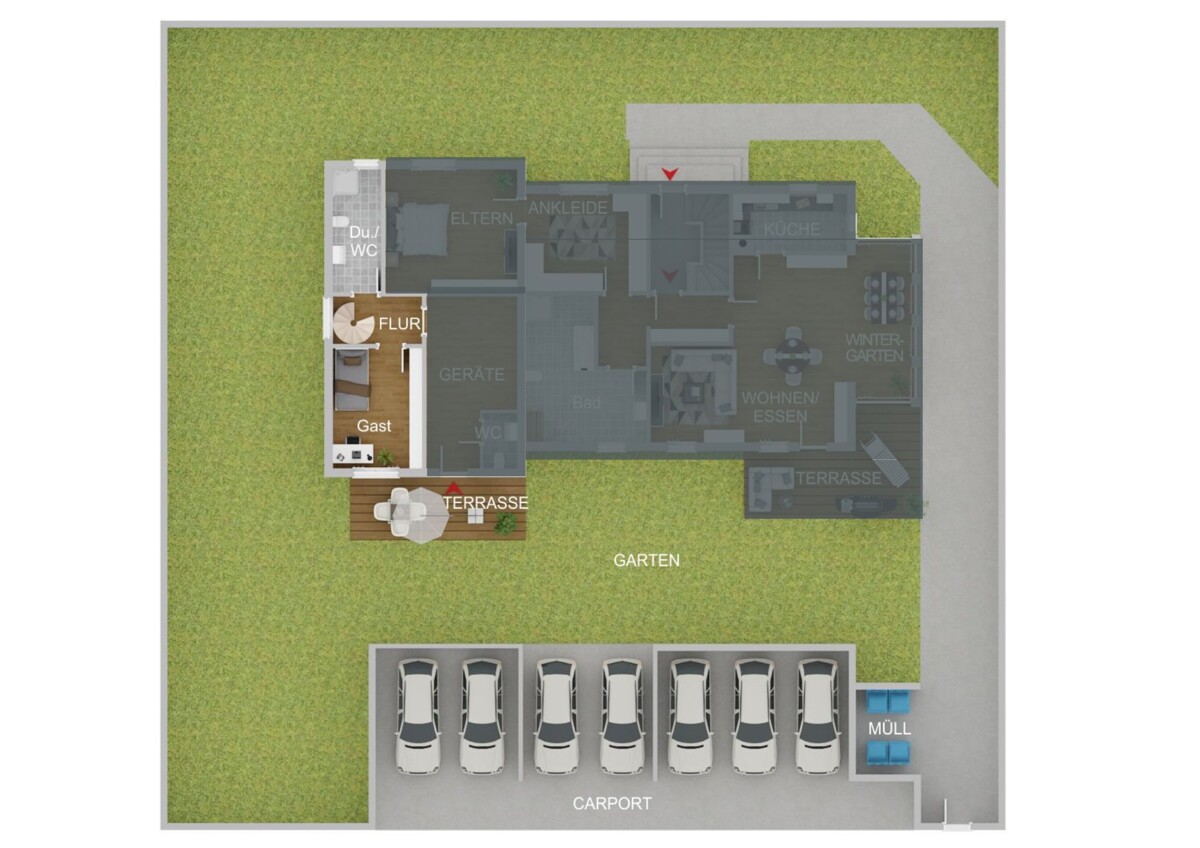 Über eine Spindeltreppe gelangt man ins Erdgeschoss, wo ein weiteres Zimmer mit direktem Zugang zur Terrasse und in den Garten zur Verfügung steht. Ein zusätzliches Gästebad mit Dusche und WC bietet hohen Komfort.