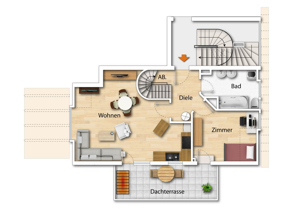 Der Wohnbereich öffnet sich zur großen, sonnigen Dachterrasse mit Glasüberdachung.