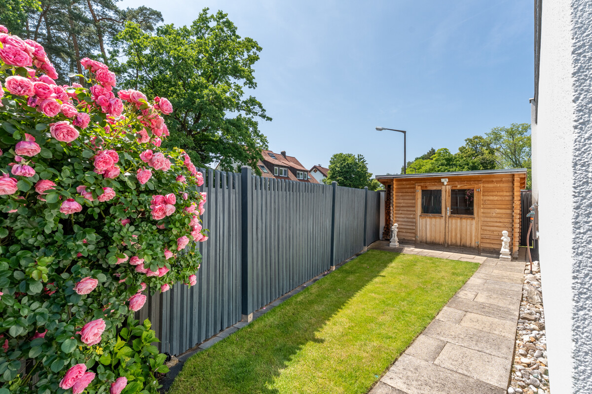 Die nach Süden ausgerichtete Sonnenterrasse sowie der neu angelegte, pflegeleichte Garten mit Sprenkleranlage, dem offenen Kamin und dem Gartenhaus bieten ideale Bedingungen für entspannte Stunden im Freien.