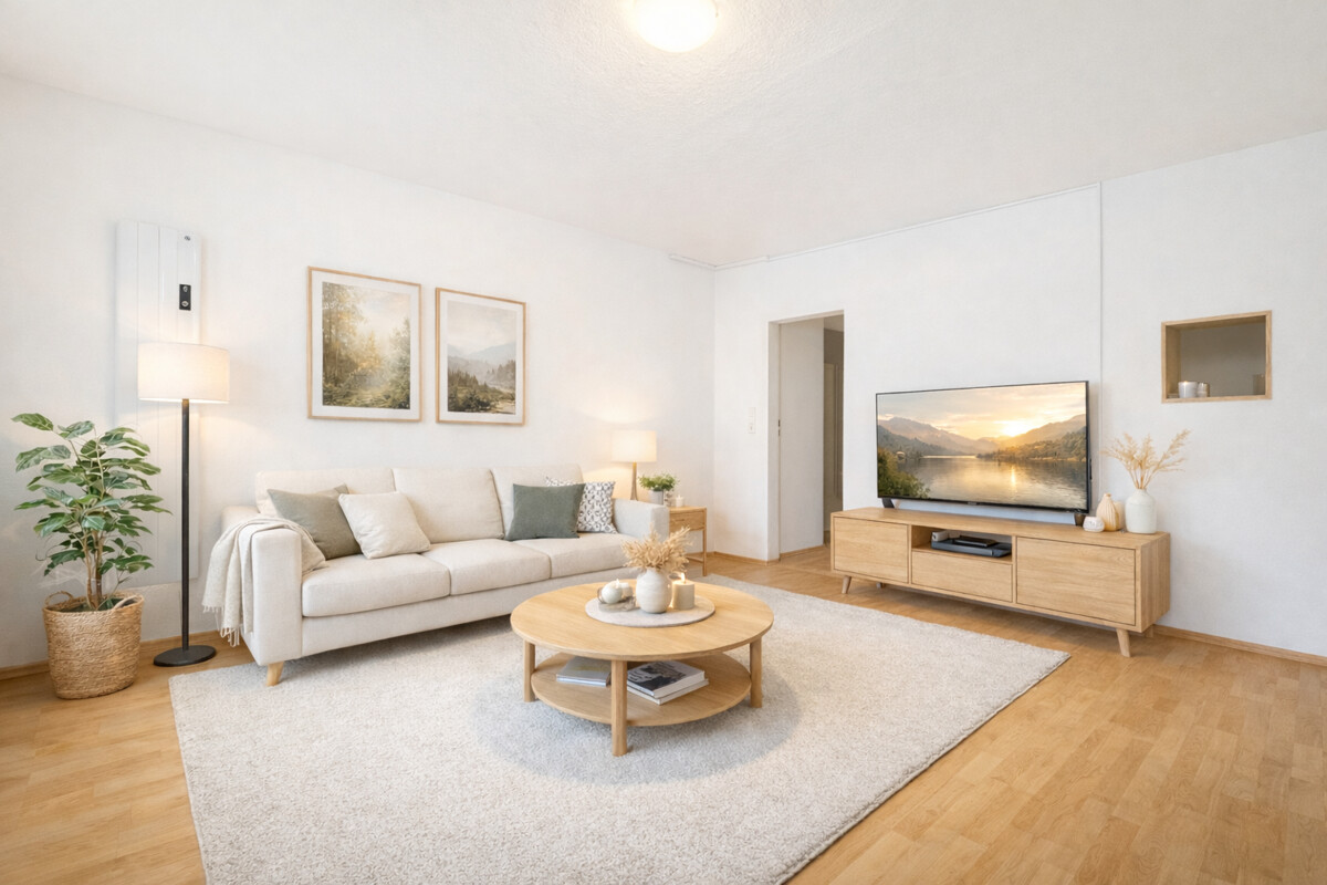 Das helle Wohnzimmer bildet den Mittelpunkt der Wohnung und bietet ausreichend Platz für Wohnen und Essen. Die integrierte Küchenlösung ist funktional eingebunden.