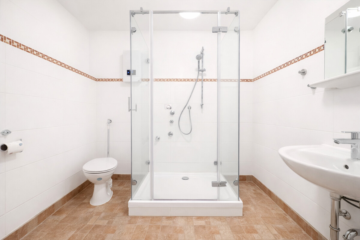 Die separate Schlafnische schafft eine klare Trennung zwischen Wohn- und Rückzugsbereich. Das modern ausgestattete Badezimmer mit Glasdusche rundet das stimmige Gesamtbild ab.