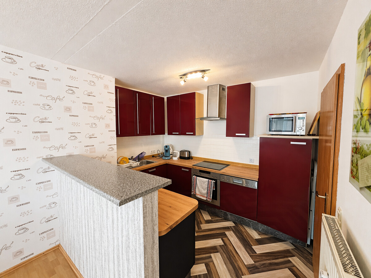 Der offen gestaltete Wohn- und Essbereich mit integrierter Küche bildet den Mittelpunkt der Wohnung. Die Raumgröße bietet Platz für Wohnen, Essen und bei Bedarf auch einen kleinen Homeoffice-Bereich. Die Einbauküche mit Theke wurde 2023 erneuert.