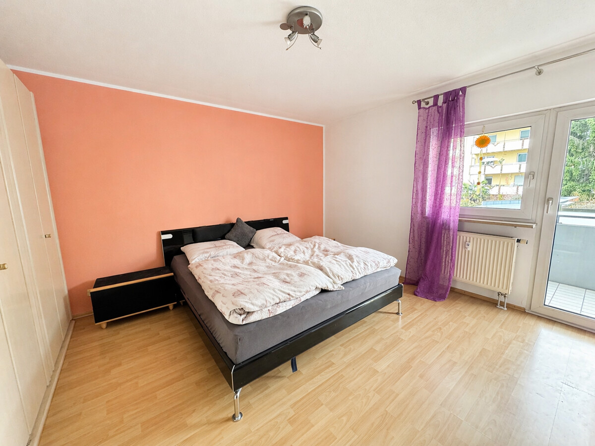 Das Schlafzimmer ist gut geschnitten und bietet ausreichend Platz für Bett und Kleiderschrank. Von hier aus gelangt man direkt auf den Balkon, der in den ruhigen Innenhof ausgerichtet ist und einen angenehmen Rückzugsort bietet.